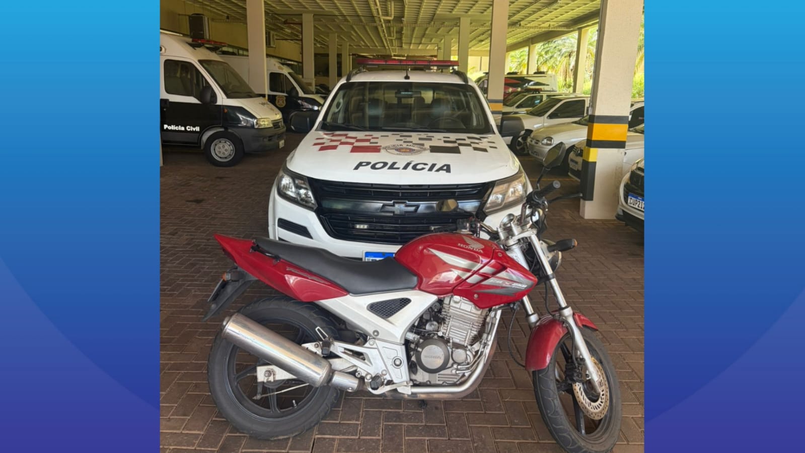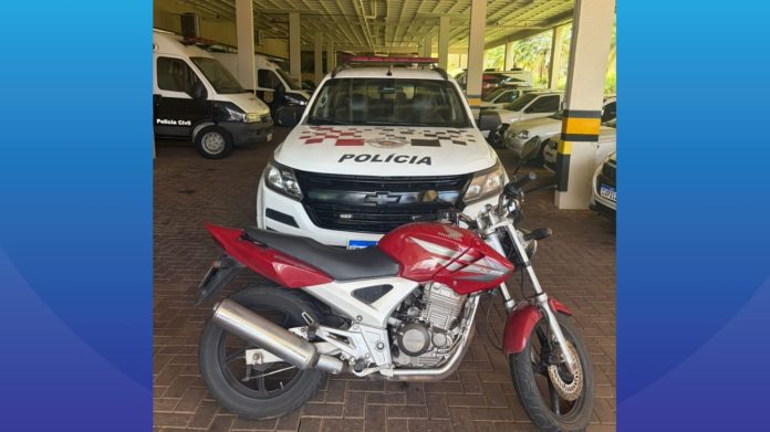 Durante buscas, os policiais avistaram uma motocicleta com as mesmas características do veículo levado e iniciaram acompanhamento, que terminou na Avenida Lúcio Martelli, no Parque Residencial São Paulo. Na abordagem, nada de ilícito foi encontrado com o suspeito, porém a consulta do emplacamento confirmou que a moto havia sido roubada momentos antes.