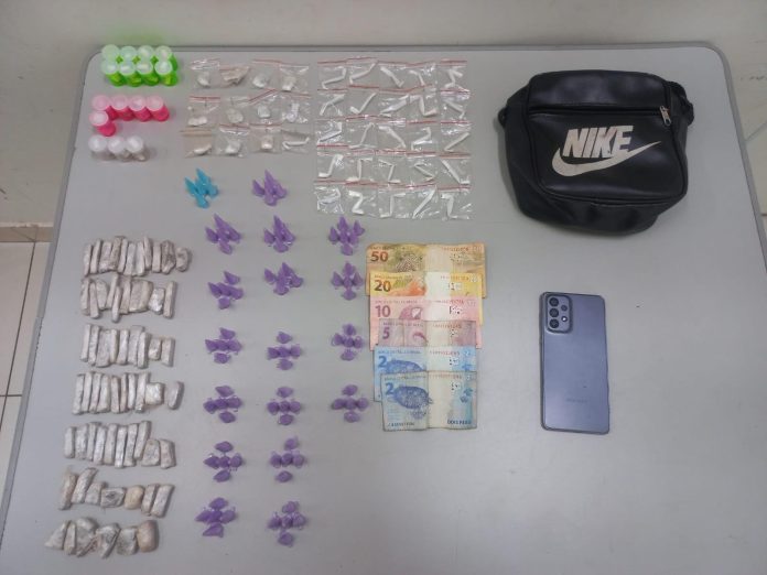 Dentro da mochila, os policiais encontraram diversas porções de entorpecentes, incluindo 91 pinos de cocaína, 63 porções de maconha, 26 papelotes de “dray”, 11 unidades de “colômbia”, além de microtubos contendo outras drogas, um celular e R$ 89 em dinheiro.