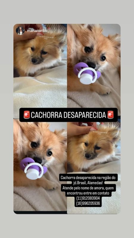 Um filhote da raça Lulu-da-pomerânia, fêmea, e que atende pelo nome de Amora desapareceu na região do Jardim Brasil, em Araraquara. A família está desesperada para encontrar o pet, pois criança de dois anos está sentindo falta.