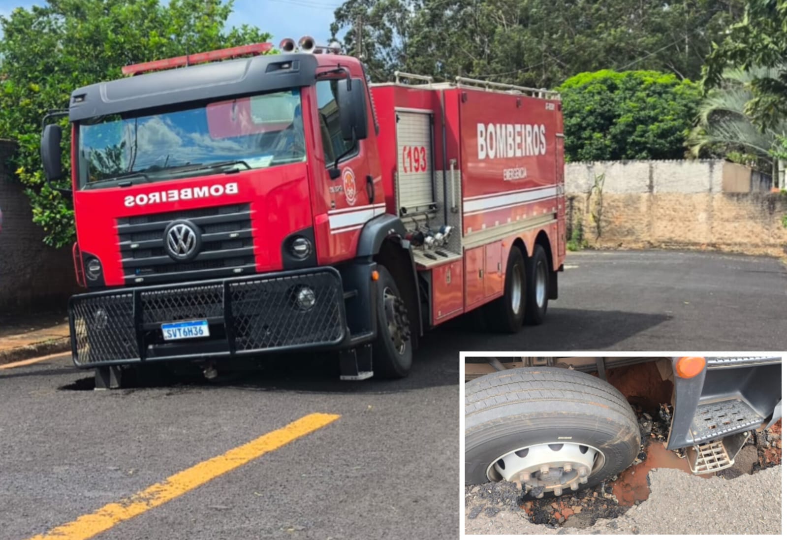Segundo informações, a equipe dos Bombeiros foi até o local verificar uma ocorrência com abelhas, e por ser uma rua sem saída, o veículo estava entrando de ré. A roda traseira passou, mas ao passar com a parte dianteira o asfalto cedeu, deixando o caminhão preso no buraco.