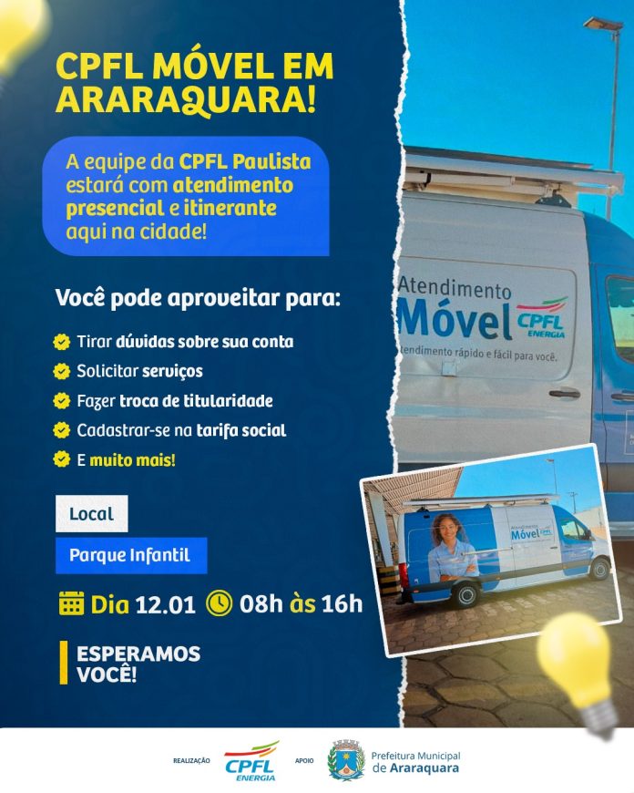 Na próxima segunda-feira (12), a unidade itinerante da CPFL Paulista estará no Parque Infantil para prestar atendimento presencial à população de Araraquara. A equipe ficará disponível no local das 8h às 16h.