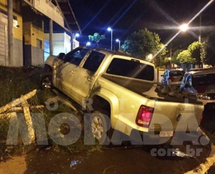 A polícia seguiu o veículo, que tentou fugir, porém o condutor perdeu o controle e bateu contra a grade de um posto de saúde.