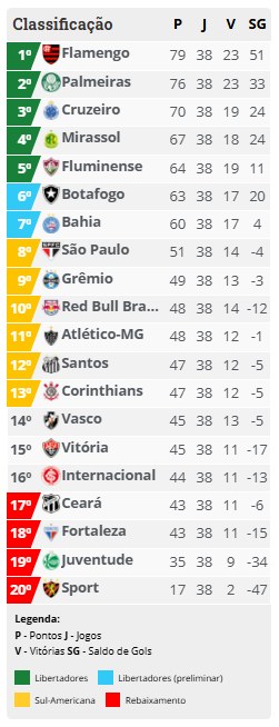 anteriormente. O Fortaleza, que vinha de oito jogos sem perder, foi derrotado pelo Botafogo e acabou caindo, enquanto o Ceará perdeu para o Palmeiras e também não conseguiu se salvar. O Internacional venceu o Bragantino por 3 a 1 no Beira-Rio e garantiu permanência, assim como o Vitória, que superou o São Paulo por 1 a 0 no Barradão.