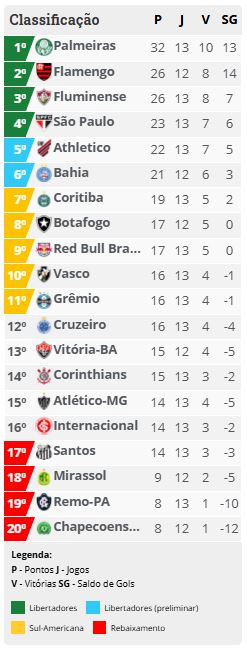 Com o resultado, o Palmeiras chega a 32 pontos e segue isolado na liderança do Brasileirão, podendo ainda ampliar a vantagem sobre os perseguidores ao fim da rodada.