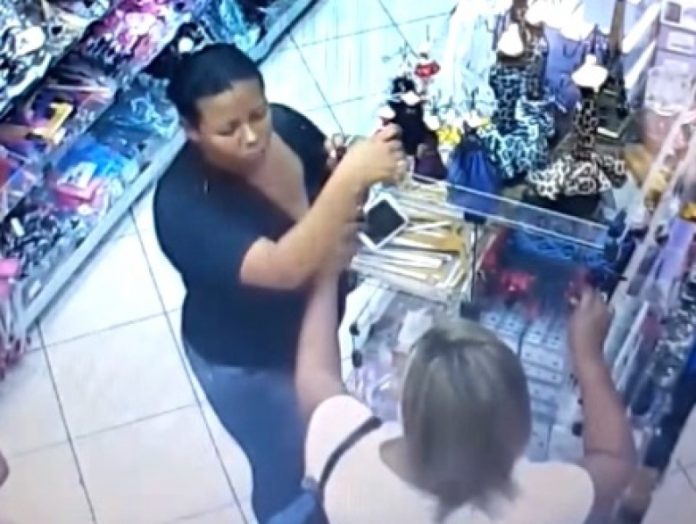 As imagens mostram a vítima circulando entre as prateleiras da loja. Duas mulheres passam a segui-la discretamente. A vítima não percebe a intenção das meliantes e segue escolhe distraidamente as mercadorias. Aproveitando um momento de maior proximidade com a cliente, uma delas enfia a mão na bolsa da mulher – aparentemente aberta – e subtrai o aparelho. Em seguida, passa para a comparsa e as duas saem do estabelecimento.