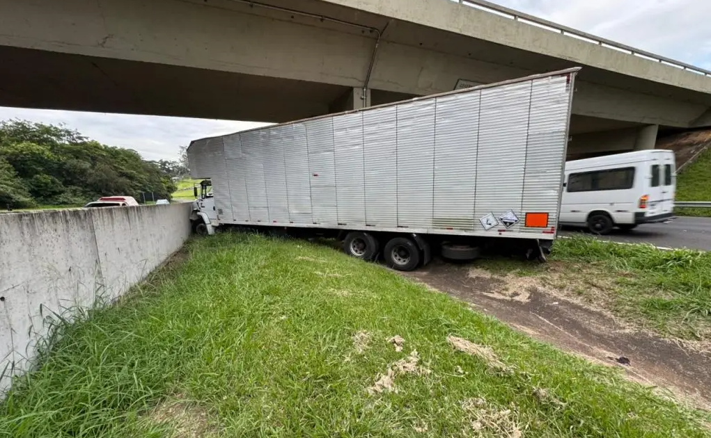 No final da tarde desta quarta-feira (17), um caminhão perdeu o sistema de freios e colidiu contra a mureta de concreto na Rodovia Washington Luís (SP-310), na altura do km 235, em São Carlos.