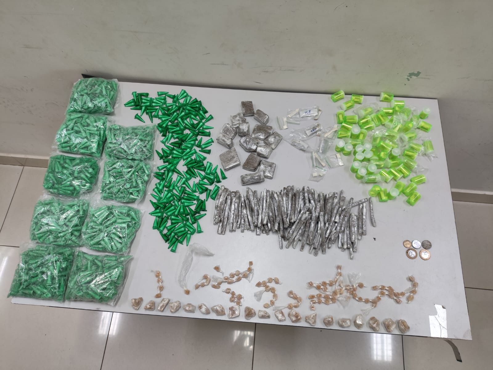 No quarto ao lado estava o suspeito, que alegou desconhecer a droga e afirmou ter ocupado o imóvel há cerca de cinco meses. Na bolsa, os policiais localizaram pinos de cocaína, porções de maconha, pedras de crack e haxixe.