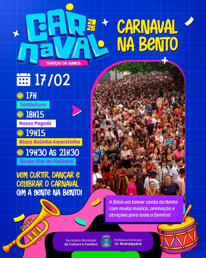 O “Carnaval 2026 – Tradição da Alegria”, realizado pela Prefeitura de Araraquara, terá o tradicional “Carnaval na Bento” na terça-feira, 17 de fevereiro, das 17h às 21h30. A programação gratuita é um dos destaques da festa realizada pela Secretaria Municipal de Cultura e Fundart na cidade.