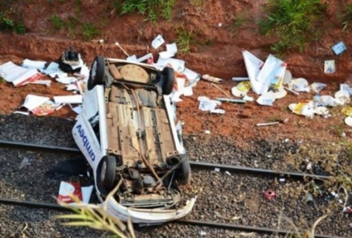 O carro um moldelo GM Celta, que pertence há uma empresa de bebidas, caiu de uma altura de 12 metros, sobre a linha férrea da ALL.