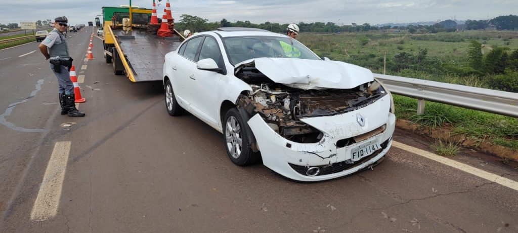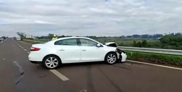 Um Renault Fluence branco colidiu contra a defensa metálica na SP-225, próximo ao acesso para o bairro Parque São Paulo, em Araraquara, na manhã desta terça-feira (4).