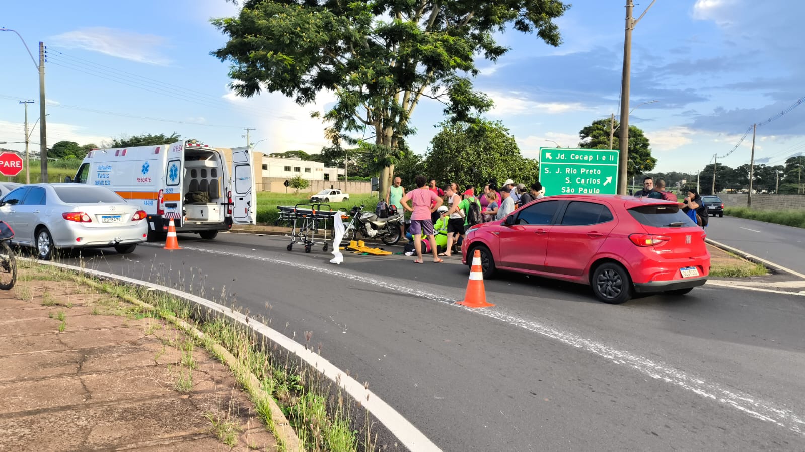 Um casal foi socorrido após se envolver em um acidente de trânsito na rotatória da Ambev, na via de acesso Engenheiro Ivo Najin na tarde desta segunda-feira (16). Eles estavam em uma motocicleta quando ocorreu a colisão.