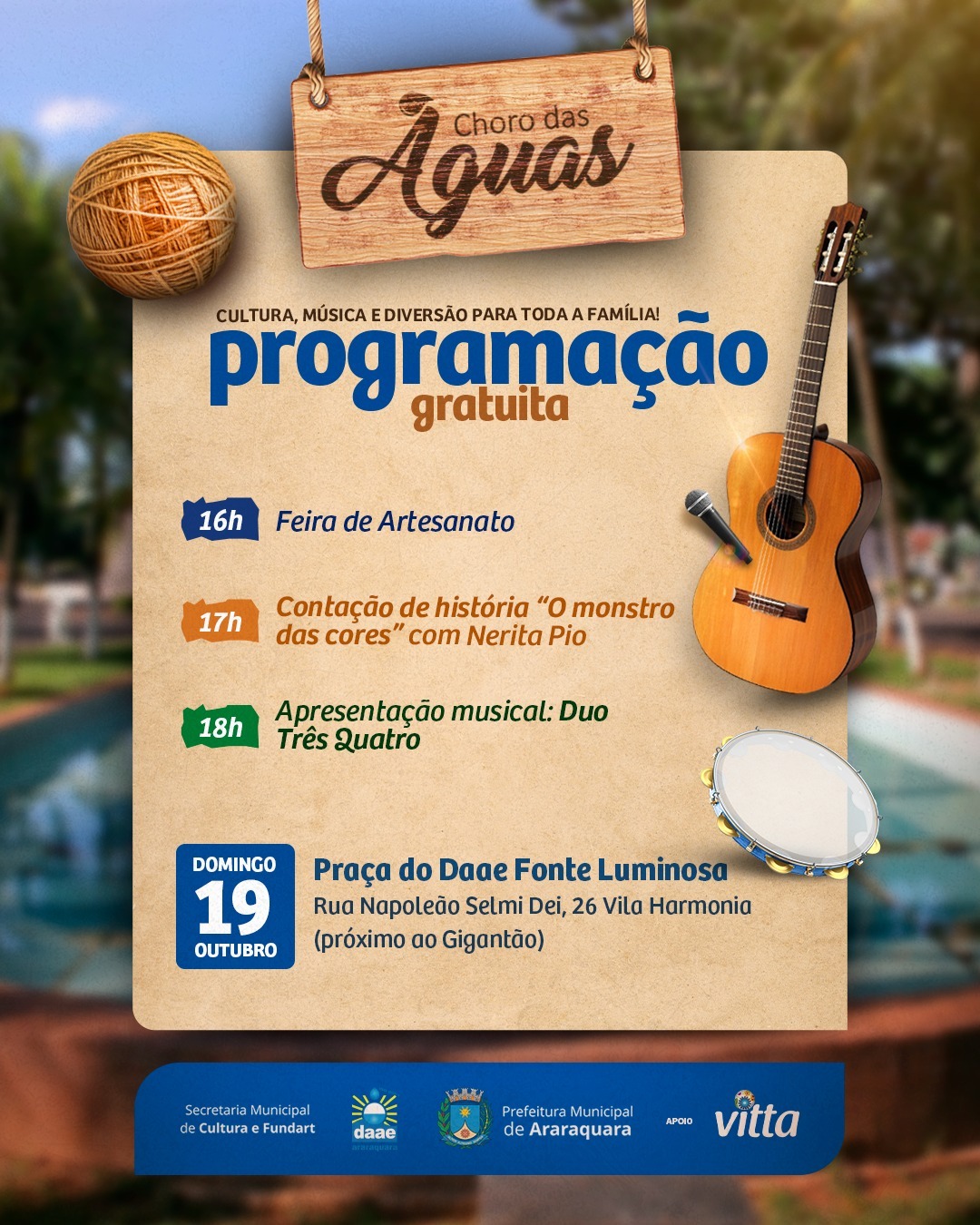 O projeto Choro das Águas, realizado pela Secretaria Municipal da Cultura e Fundart, promete uma tarde de atrações variadas e para todas as idades neste domingo (19), na Praça do Daae – Fonte Luminosa. Na programação, destaque para a apresentação música com Duo Três Quatro, além de contação de histórias com a atriz Nerita Pio e a tradicional feira de artesanato.