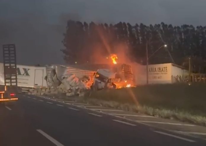 Uma colisão entre dois caminhões terminou em incêndio na noite desta terça-feira (31), na Rodovia Washington Luís, na região de Ibaté.