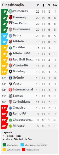 Com os resultados, o Palmeiras segue na liderança isolada, com 26 pontos, enquanto o Corinthians é o 16º colocado, com 11. Já o Red Bull Bragantino aparece na zona intermediária da rodada, em nono lugar, com 14 pontos. O Cruzeiro é o 17º, com 10.