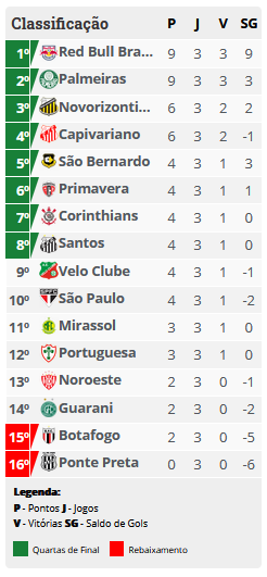 O Red Bull Bragantino manteve a liderança ao golear o Botafogo por 5 a 0 neste domingo, no estádio Cícero de Souza Marques, pela terceira rodada da competição. Com a vitória, o time de Bragança Paulista chegou aos nove pontos e segue com 100% de aproveitamento, mesma campanha do Palmeiras, enquanto o Botafogo permanece sem vencer e soma apenas dois pontos, pressionado na parte de baixo da tabela.