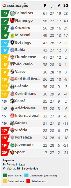 Com o resultado, o Corinthians se reabilita após perder para o Santos por 3 a 1. O time agora aparece em 12º lugar com 36 pontos, oito a mais do que o Vitória, que abre a zona de rebaixamento, em 17º, com 28. Já o Atlético segue com 33 e aparece em 14º.