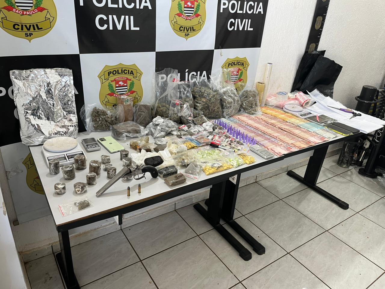 Após investigação, os policiais cumpriram mandado em um apartamento na Rua Domingos Braghini, onde encontraram grande quantidade de drogas, como maconha, haxixe, cocaína, MDA e outras substâncias sintéticas, além de dinheiro, balanças de precisão, celulares e materiais usados no tráfico. O jovem admitiu que armazenava os entorpecentes no local.