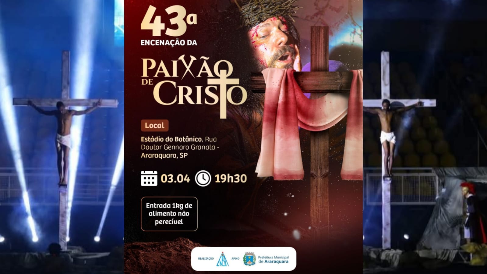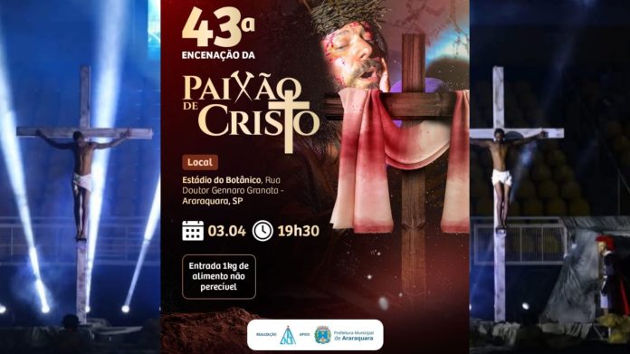 A Associação Comunitária, Educativa, Cultural e Religiosa ENSA (Encenação Nossa Senhora Aparecida) convida a população a participar da 43ª edição da Encenação de Jesus Cristo, que acontece no dia 3 de abril, às 19h30, no Estádio Municipal do Botânico .