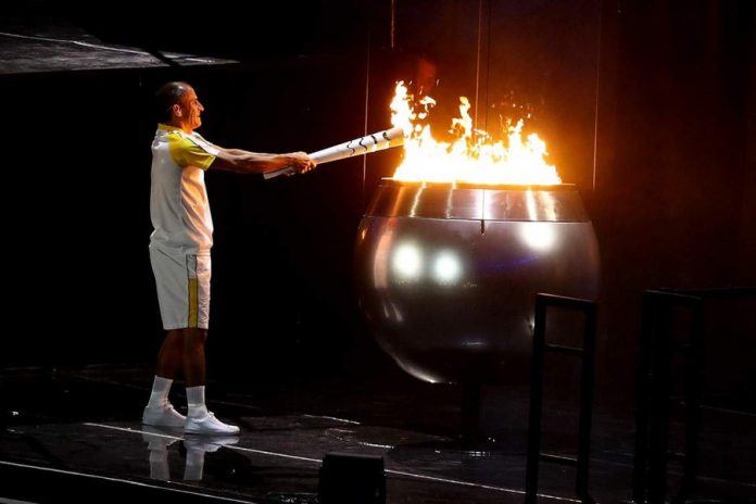 Ao fim da apresentação de Caetano Veloso, Gilberto Gil e Anitta, a Tocha Olímpica, que viajou o país nos últimos meses, entrou no Maracanã nas mãos do ex-tenista Gustavo Kuerten. Após desfilar sob muitos aplausos, ele repassou a Tocha à ex-jogadora de basquete Hortência Marcari. A vencedora da medalha de prata com a seleção feminina em 1996 passou a chama ao ex-maratonista Vanderlei Cordeiro de Lima, que acendeu a Pira.