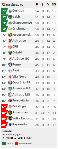 Com o resultado, a Locomotiva estaciona nos 36 pontos (8 vitórias, 12 empates e 11 derrotas) e ocupa a 16ª colocação, uma posição acima da zona de rebaixamento. Já a Chapecoense termina a rodada na terceira colocação com 50 pontos.