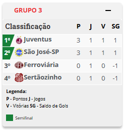 No outro jogo válido pelo Grupo 3, o São José venceu o Sertãozinho fora de casa por 2 a 1 neste sábado (14). Com os resultados, Juventus e São José lideram a chave com 3 pontos, enquanto Ferroviária e Sertãozinho ainda não pontuaram. Nesta etapa da competição, os clubes se enfrentam em turno e returno, e apenas os dois melhores colocados avançam às semifinais. Os dois finalistas subirão para a Série A1 de 2027.