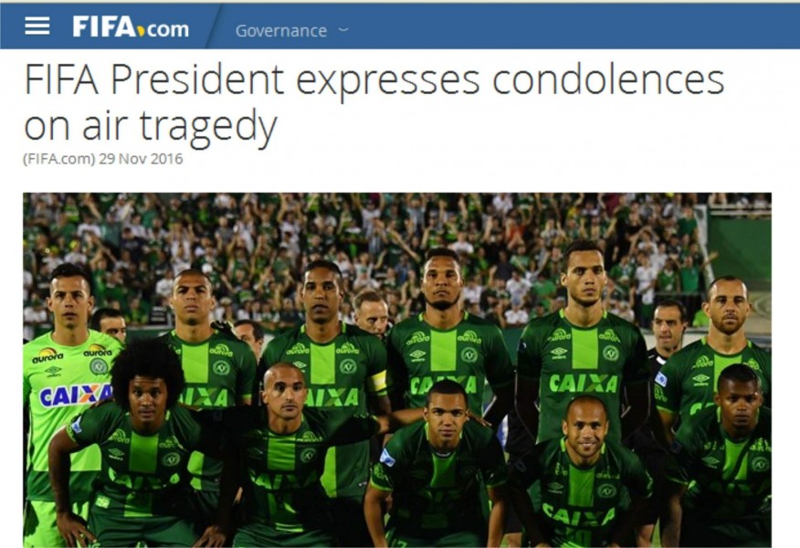 Entidade que comanda o futebol mundial, a Fifa lamentou o acidente aéreo que levava a delegação da Chapecoense até a Colômbia, onde disputaria a final da Copa Sul-Americana contra o Atlético Nacional. Pelas redes sociais, a entidade divulgou uma nota sobre o assunto.