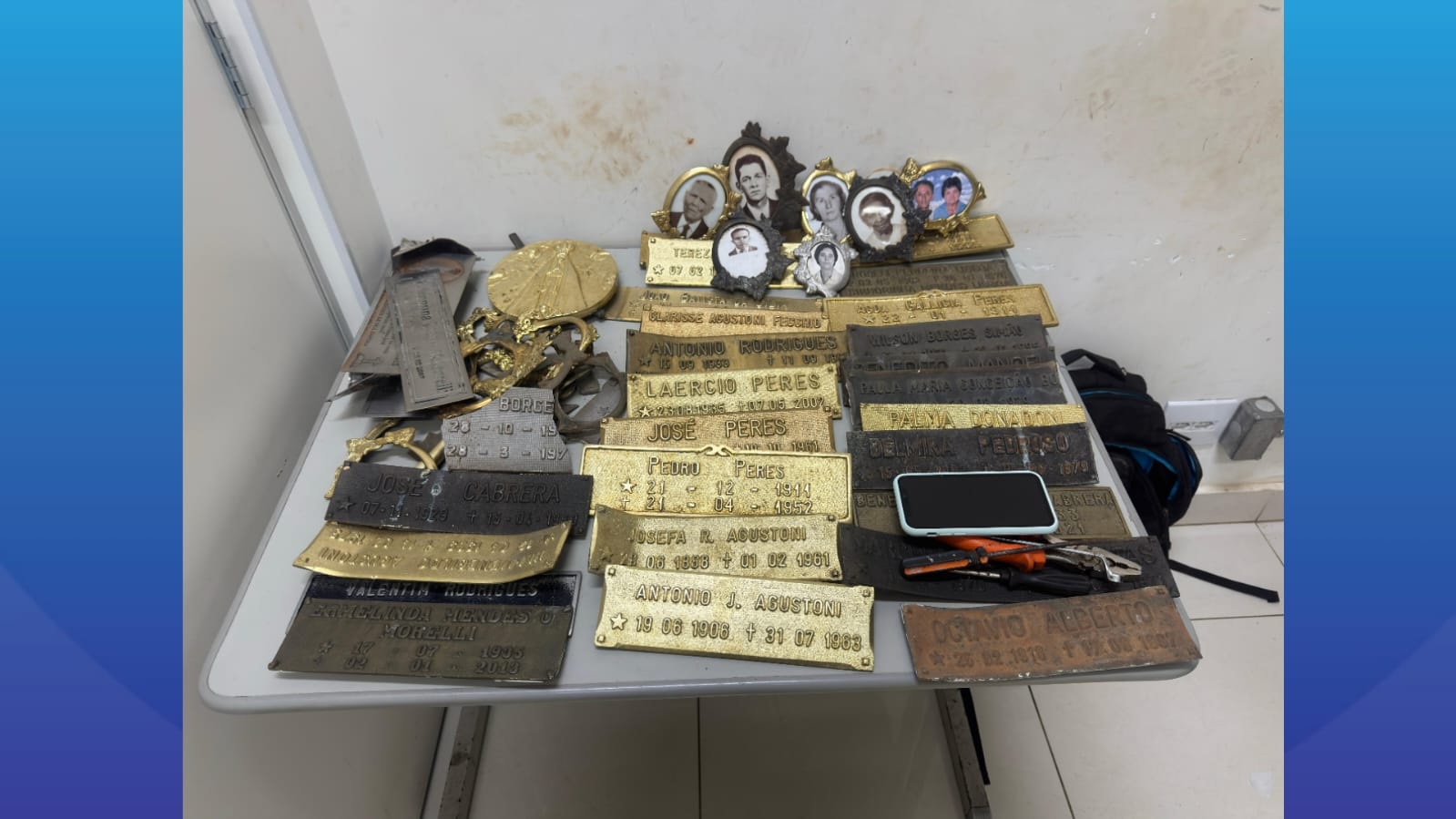 O homem confessou o furto e afirmou que o comparsa aguardava do lado de fora para transportar o material, que seria vendido como sucata. Na mochila foram encontradas placas de identificação, porta-retratos, uma imagem religiosa e ferramentas.