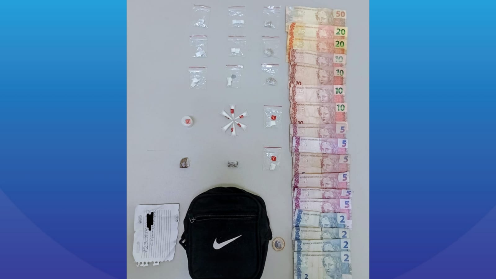 Durante a abordagem e a revista pessoal, os guardas encontraram diversas porções de entorpecentes, entre elas cocaína, maconha, “dry” e “ice”, além de dinheiro em notas trocadas e uma anotação com possíveis registros de movimentações financeiras via PIX, o que indicaria a prática do tráfico.