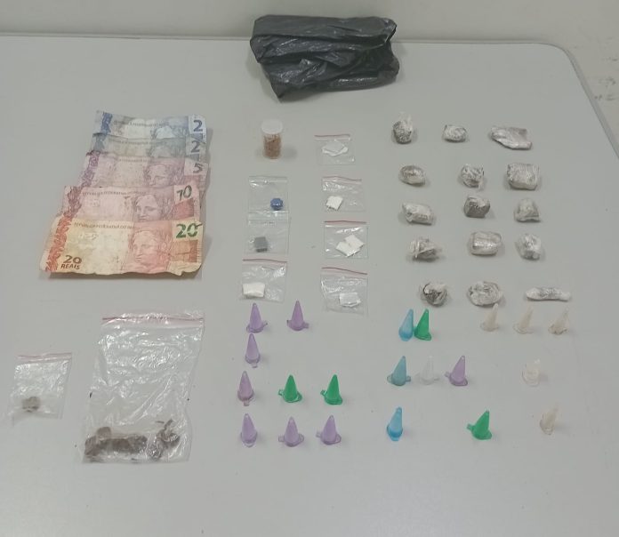 Durante a revista, os guardas encontraram uma sacola plástica contendo diversas porções de drogas, entre elas maconha, haxixe, substâncias análogas a MD, cocaína e crack, todas já fracionadas e embaladas para a venda. Também foi apreendida uma quantia em dinheiro em espécie.