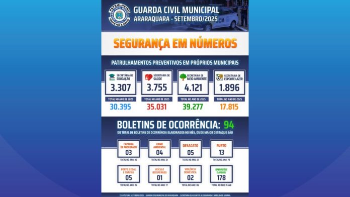 A Guarda Civil Municipal de Araraquara registrou 94 boletins de ocorrência em setembro de 2025, com destaque para preservação de direitos (25), dano ao patrimônio (12) e evasão (11).