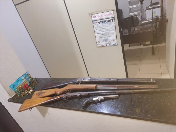 Segundo informações, a Polícia Militar foi acionada após denúncia de tiros na rua e, durante a averiguação em um imóvel, localizou três carabinas, uma garrucha e diversas munições.