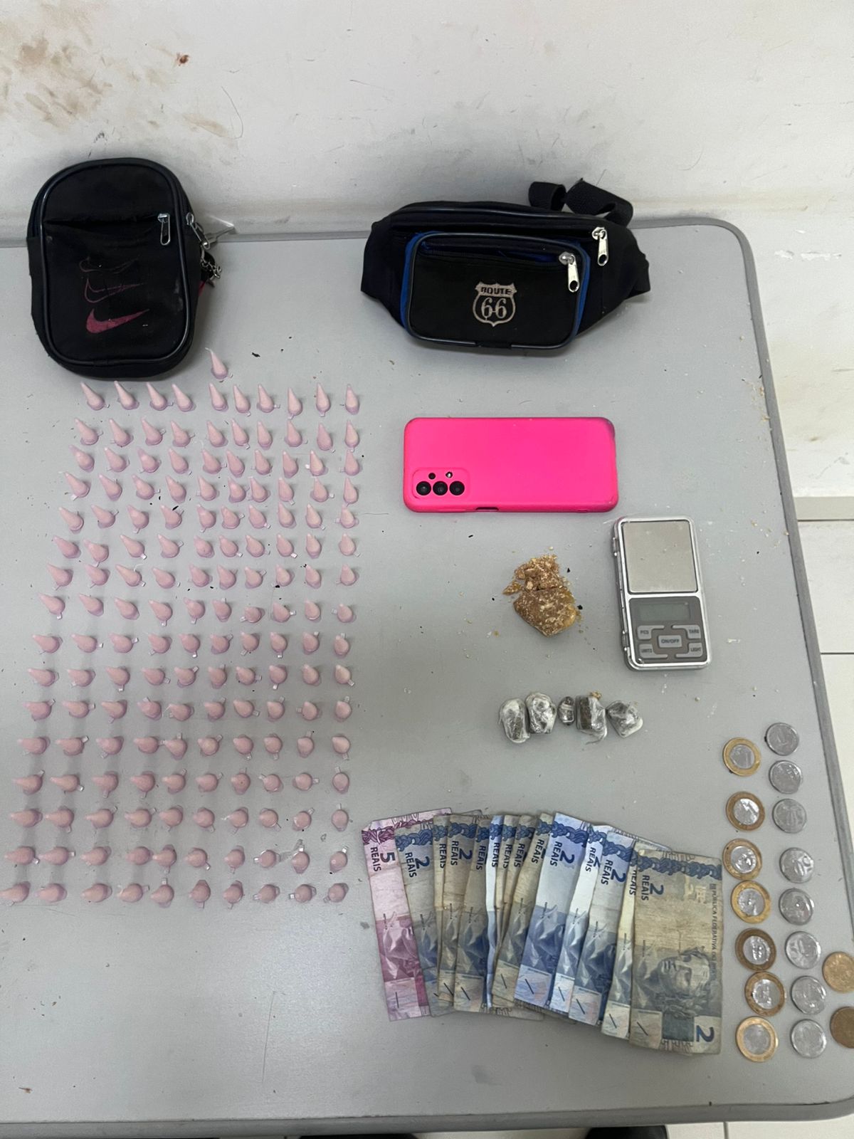 Durante a revista, os policiais encontraram na outra pochete 161 eppendorfs de cocaína, uma pedra de crack para fracionar, cinco porções de maconha, além de um celular e dinheiro em diversas cédulas e moedas.