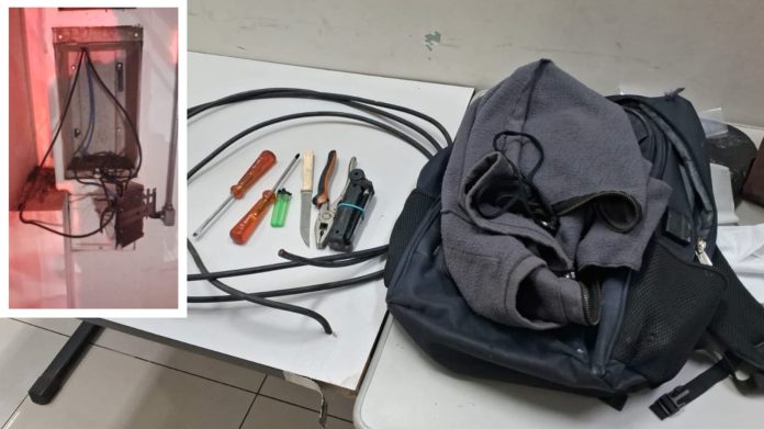 Os agentes retornaram ao local onde o individuo estava momentos antes e foi constatado que o relógio de entrada de energia elétrica do estabelecimento estava danificado, bem como dois fios de 16 mm haviam sido cortados, sendo que um deles já se encontrava ao solo.