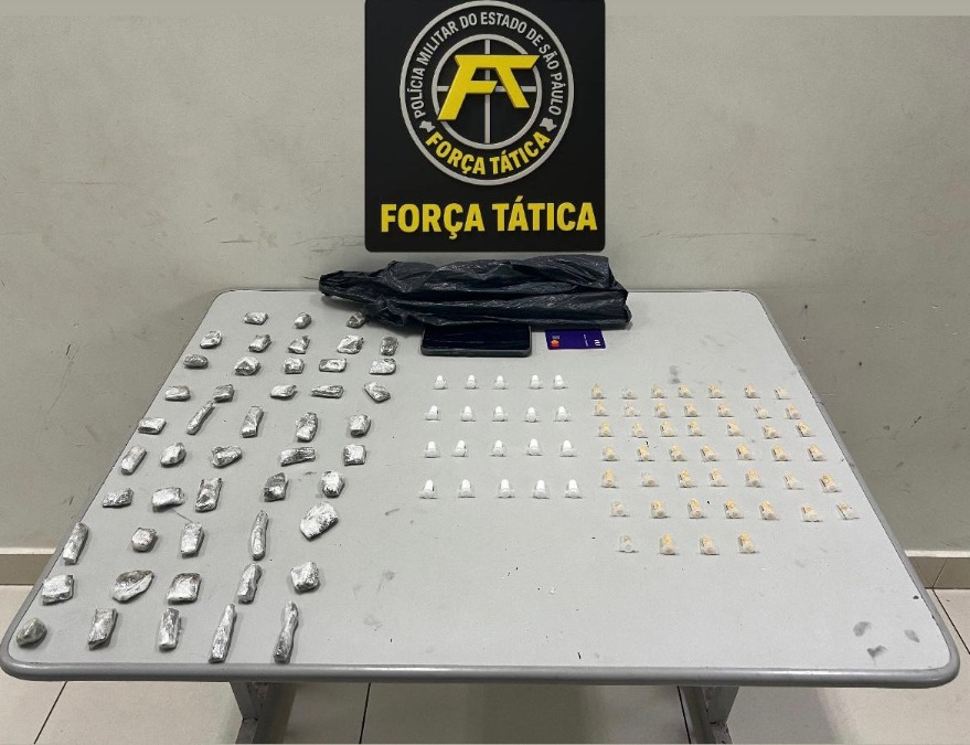 Durante a revista, os policiais encontraram cocaína, maconha e crack, além de celular e cartão bancário. As drogas estavam embaladas para comercialização, em um local conhecido pelo tráfico.