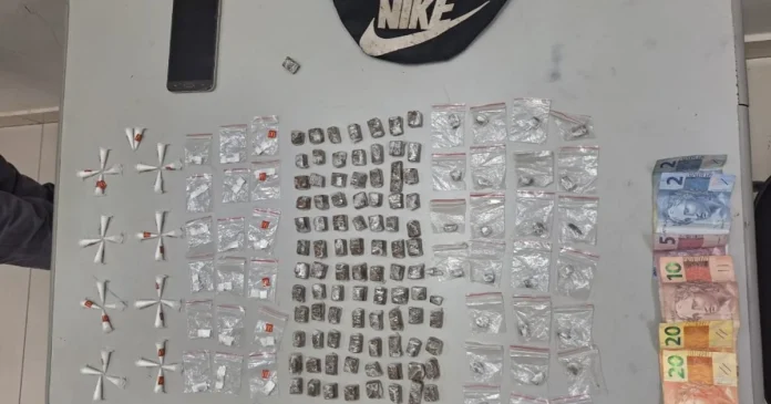 Durante a abordagem, os policiais encontraram uma pochete com diversas porções de drogas, incluindo cocaína, maconha e “ice”, além de dinheiro e um celular. O segundo suspeito foi localizado em seguida.