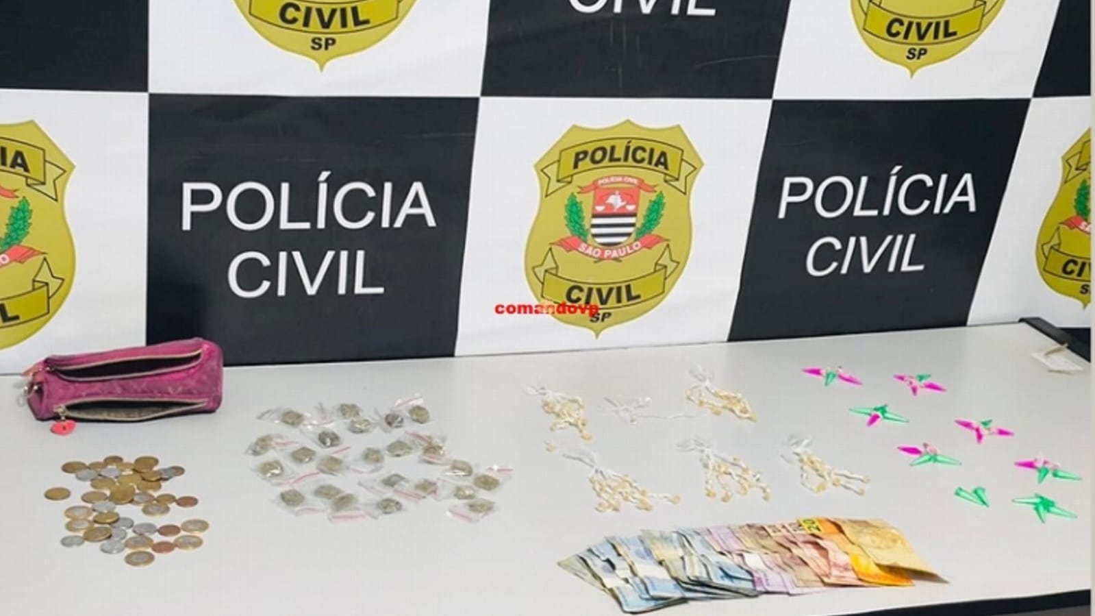 Durante o cumprimento de mandado de busca e apreensão, os policiais, sob comando do delegado Miguel Capobianco Junior, localizaram R$ 181,20 em dinheiro, 24 porções de maconha, 30 microtubos de cocaína e 130 pedras de crack.