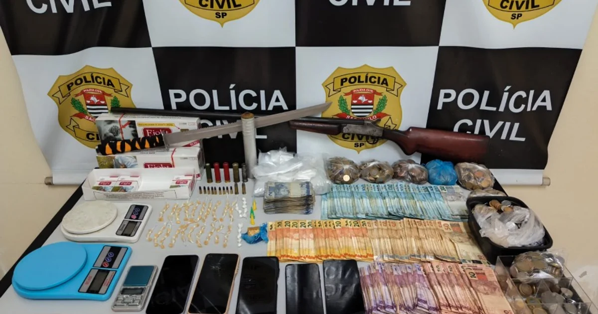 No local, os policiais encontraram 95 pedras de crack prontas para venda, porções maiores da droga, cocaína embalada e pinos já preparados para comercialização. Também foram apreendidos uma espingarda calibre 28 com munições, munições de outros calibres, mais de R$ 10 mil em dinheiro, balanças de precisão e materiais para embalo.