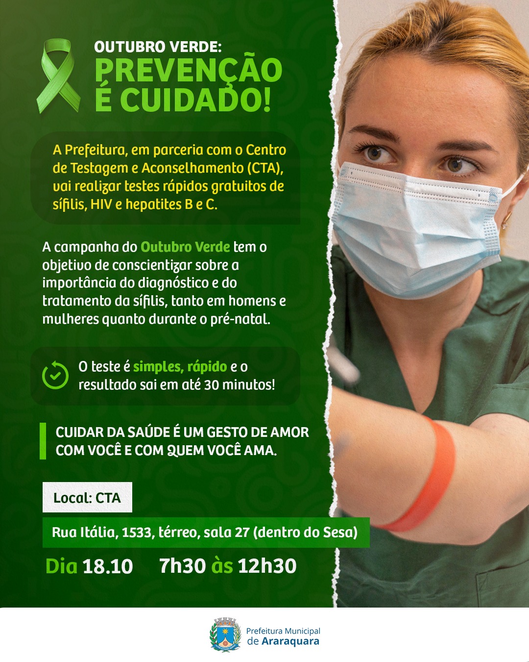 O Centro de Testagem e Aconselhamento (CTA) de Araraquara vai realizar neste sábado (18) testes rápidos gratuitos de sífilis, das 7h30 às 12h30. O CTA fica dentro da unidade do Sesa, localizado na Rua Itália, 1533, térreo, sala 27. A ação acontece em alusão ao Outubro Verde, instituído pela lei federal nº 13.430/2017, que determina a realização do Dia Nacional de Combate à Sífilis e à Sífilis Congênita anualmente no terceiro sábado de outubro. No mesmo dia também serão disponibilizados testes rápidos de HIV e Hepatite B e C.