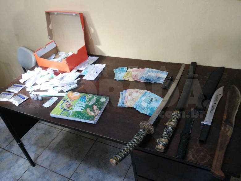 Foram apreendidas facas, espadas, grande quantidade em dinheiro, caderno com anotações do tráfico. Além disso, duas aves silvestres foram apreendidas, uma delas ameaçada de extinção, que implicou numa multa de 5 mil reais.