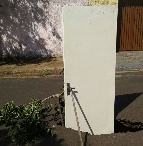 A cena ganhou as redes sociais, devidamente acompanhada de dezenas de reclamações contra o setor responsável pela manutenção das vias. Além da crítica, a porta presta a outro serviço: alerta os motoristas e evita acidentes no local.