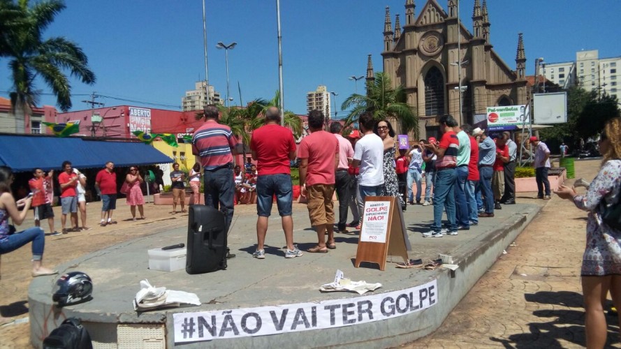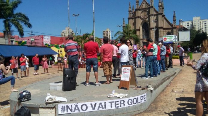 Uma faixa com a frase “Araraquara em defesa da democracia, contra o golpe!” foi exposta no meio da Praça de Santa Cruz.