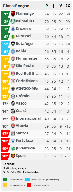 A 35ª rodada do Campeonato Brasileiro segue nesta segunda-feira (24), com mais dois jogos. A partir das 19h, Mirassol e Ceará se enfrentam no Maião, pouco antes de Internacional e Santos, no Beira-Rio, em duelo direto na briga contra o rebaixamento.