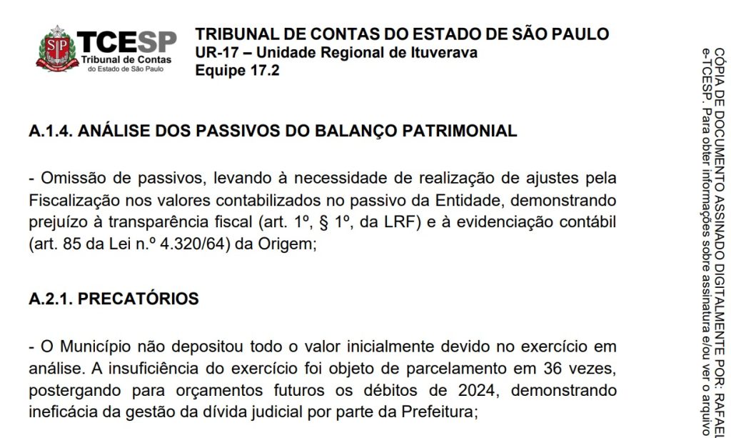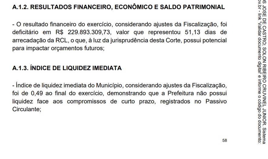 O Tribunal também destacou que o município não tinha liquidez para honrar compromissos de curto prazo e que houve omissão de passivos, prejudicando a clareza das contas públicas.