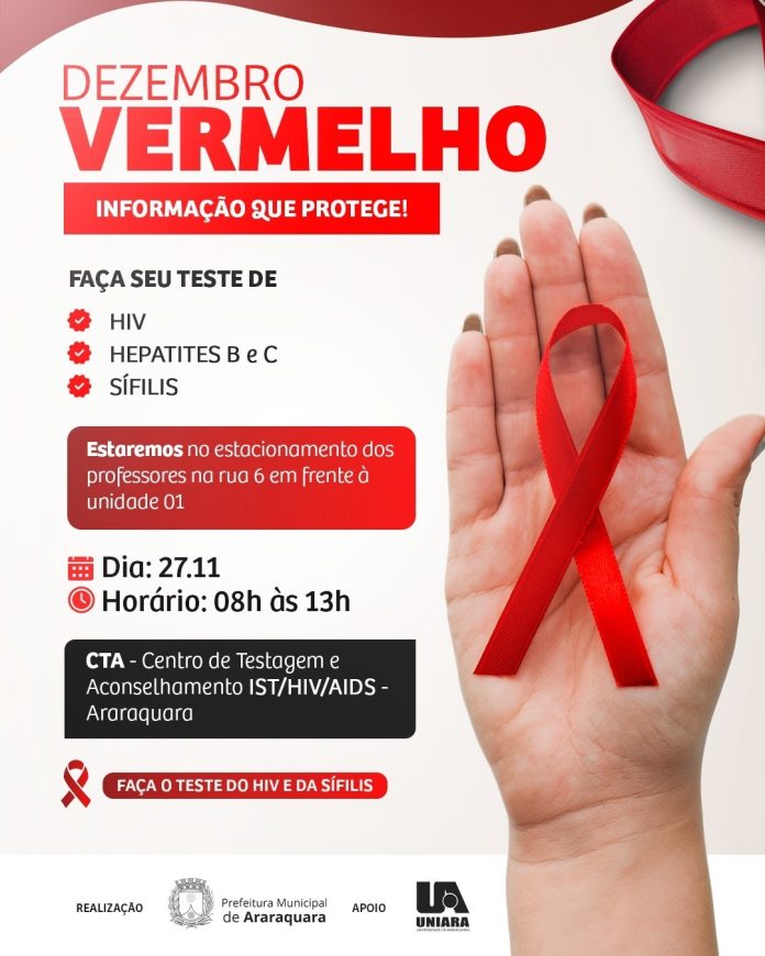 A Prefeitura promove no dia 1º de dezembro uma ação especial do Dezembro Vermelho com a realização de testes rápidos gratuitos para HIV, sífilis e hepatites B e C.