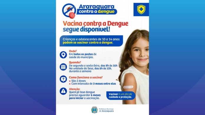 A vacina contra a dengue continua disponível nos polos de vacinação de Araraquara para crianças e adolescentes de 10 a 14 anos.